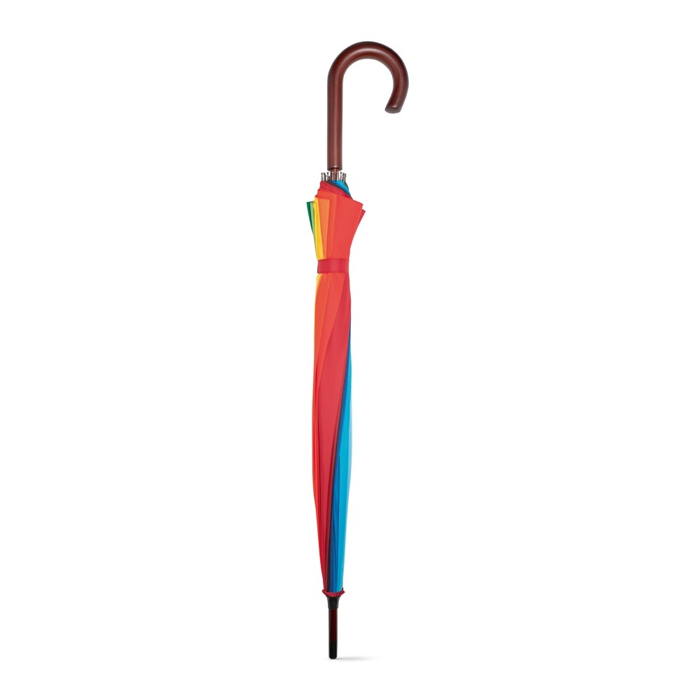 GUARDA-CHUVA ARCO-ÍRIS EM POLIÉSTER PONGEE 190T, COM 16 VARETAS E PEGA EM MADEIRA. Ø1020 X 875 MM