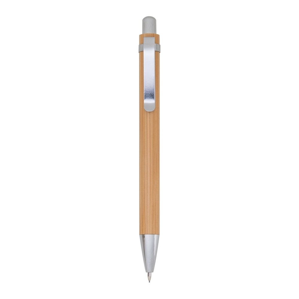 Kit ecológico caneta e lapiseira em bambu com estojo de papelão. Caneta bambu com clip metálico, aciona por clique. Lapiseira bambu com clip metálico, aciona por clique. Altura: 16.4 x Largura: 4.6cm. Medidas aproximadas para gravação: 9 x 1.1cm. Peso aproximado: 34 gramas.