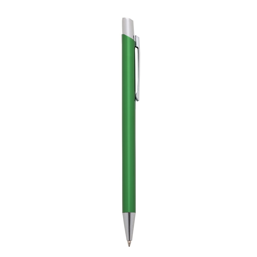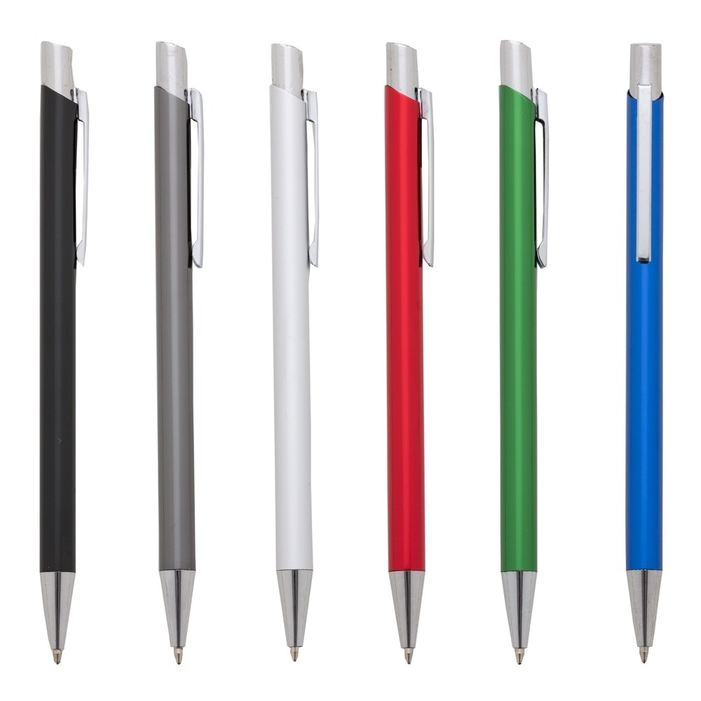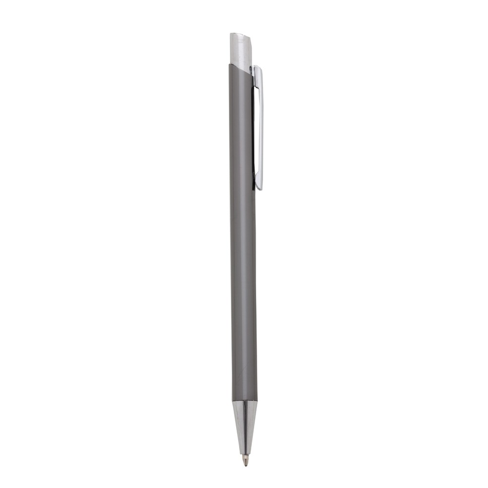 CANETA METÁLICA COM CARGA ESFEROGRÁFICA AZUL E ACIONAMENTO POR CLIQUE. MEDIDAS APROXIMADAS PARA GRAVAÇÃO: 3.7 X 0.6CM. TAMANHO TOTAL APROXIMADO: 13.9 X 1.1CM. PESO APROXIMADO: 11 GRAMAS.