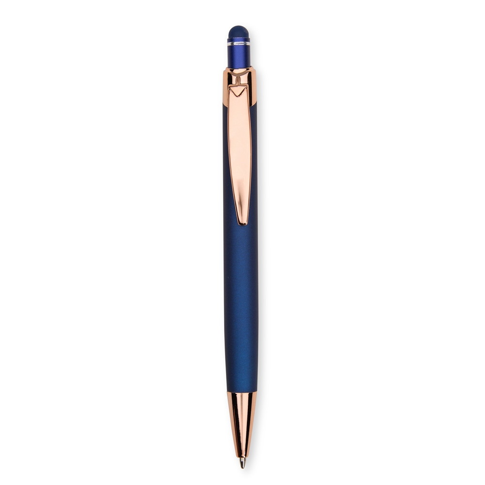 CANETA METÁLICA COM CARGA ESFEROGRÁFICA AZUL DE 1,0MM E ACIONAMENTO POR CLIQUE DE REVESTIMENTO EMBORRACHADO PARA INTERAÇÃO EM DISPOSITIVOS COM TELAS SENSÍVEIS AO TOQUE.