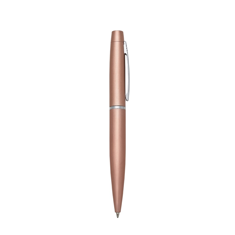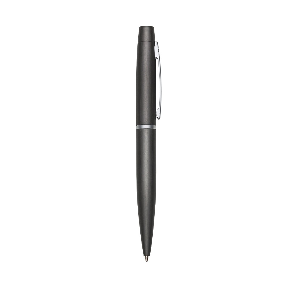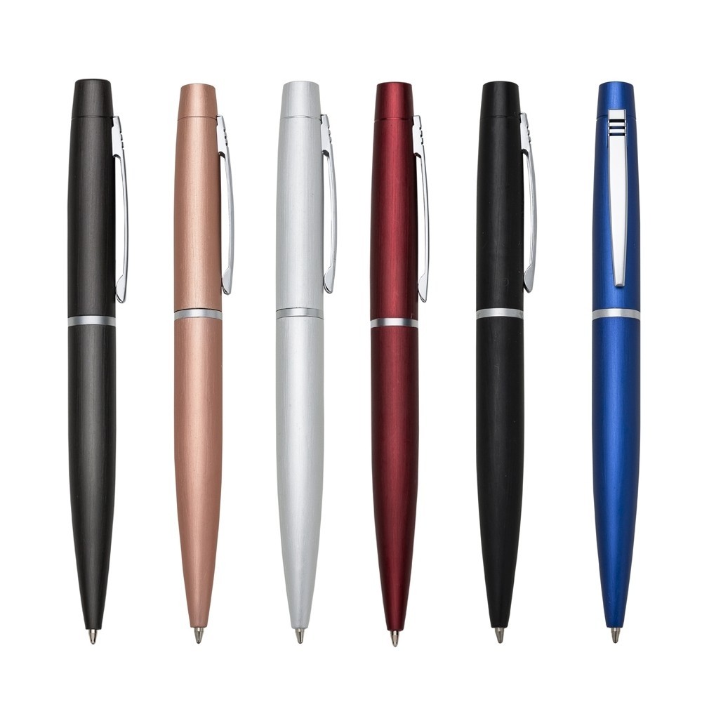 Caneta metal inteira colorida com detalhes prata. Pintura fosca, possui clip metal com três traços superior e anel prata central. Aciona por giro. Medidas para gravação: 4 x 1cm. Tamanho total: 13.5 x 1.5cm. Peso total: 21 gramas.