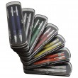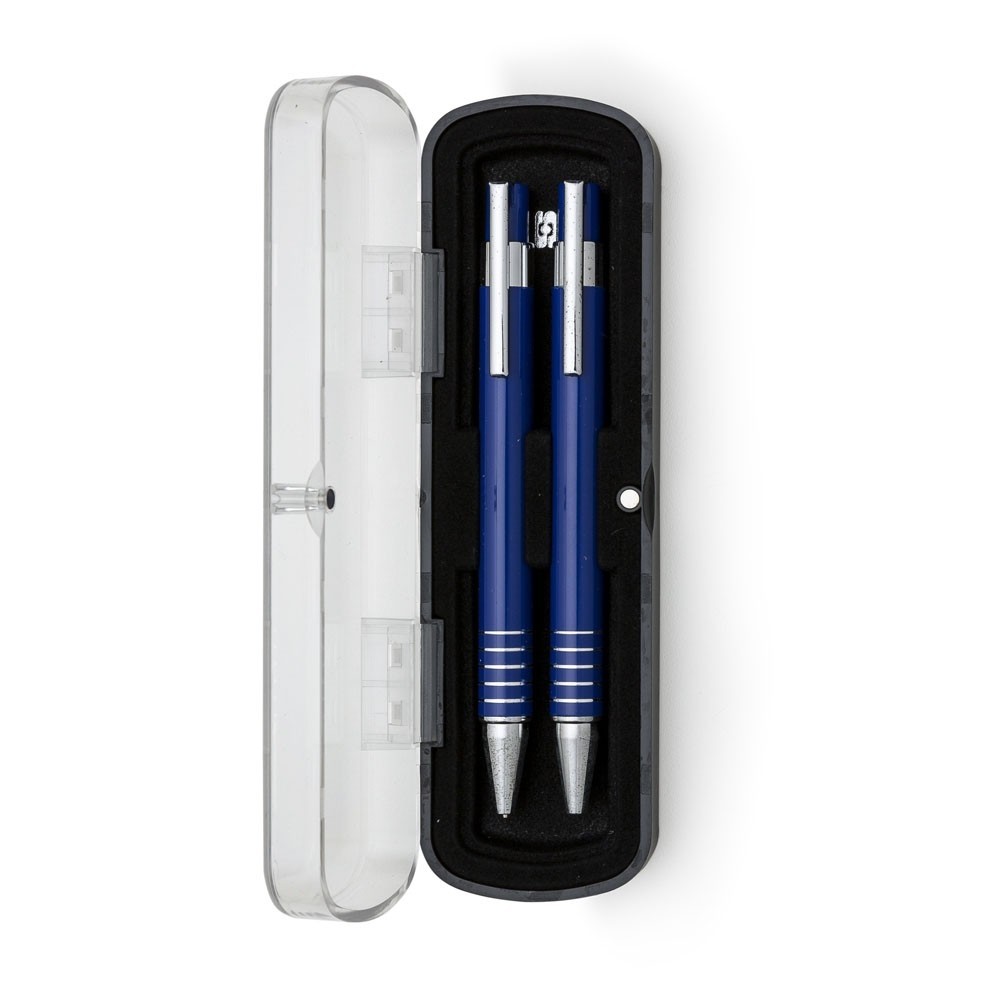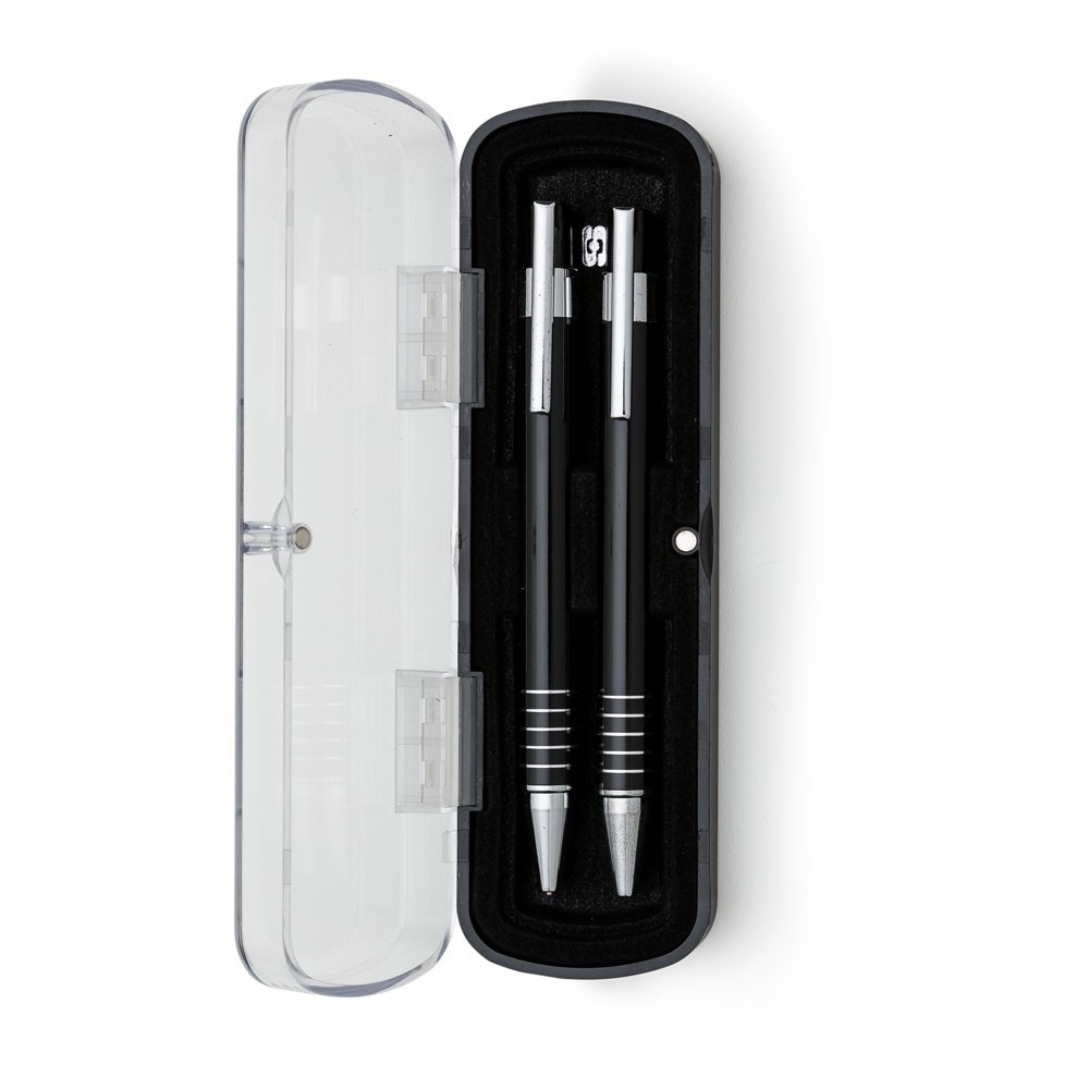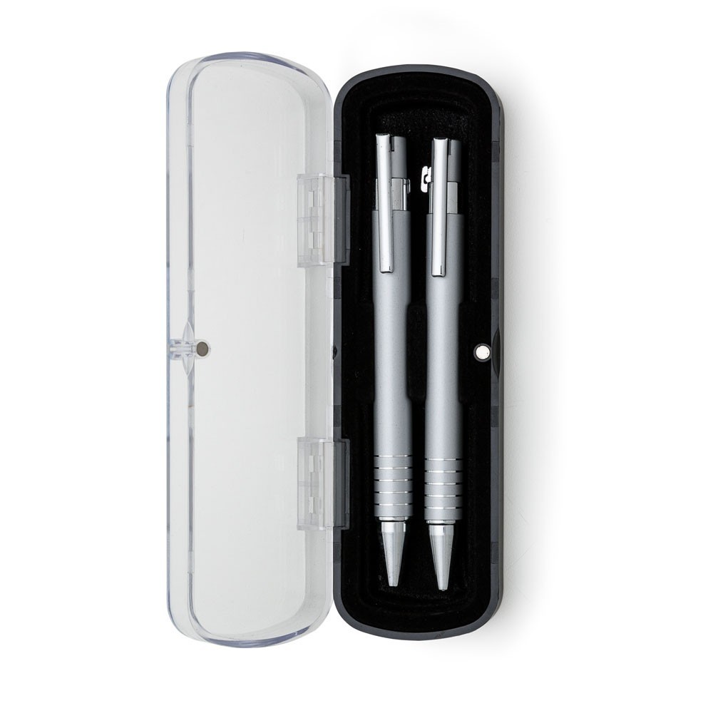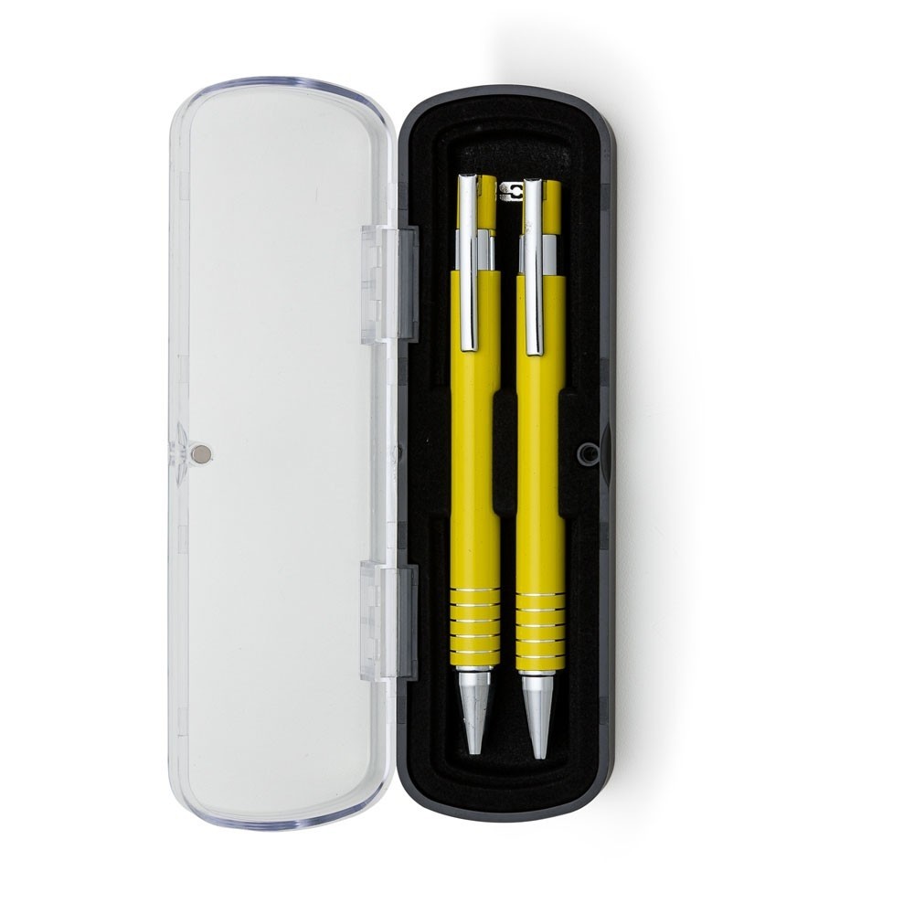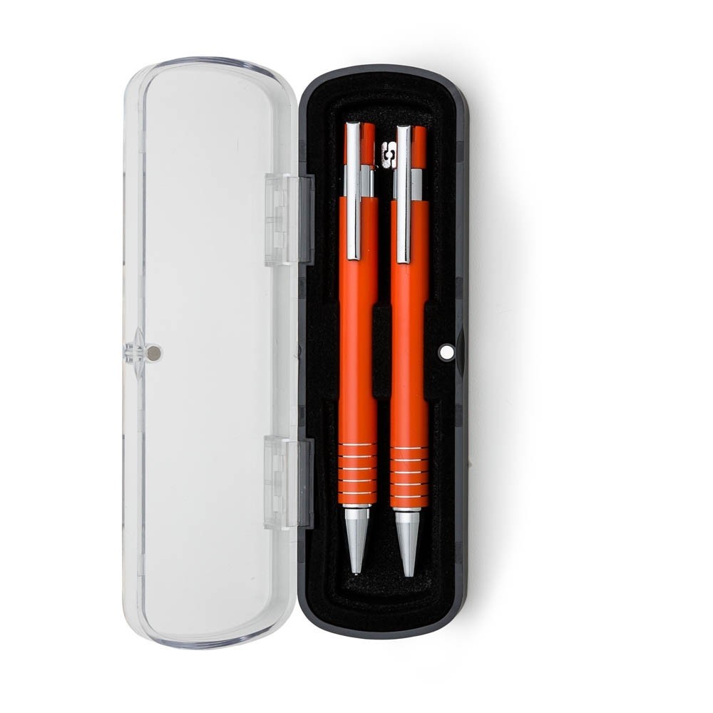 Caneta e Lapiseira semi-metal + estojo de plástico, cores disponível: Prata, Laranja, Preto, Vermelho, Branco, Azul, Amarelo e Verde. Contém: 1 Caneta esferográfica semi-metal, 1 Lapiseira de semi-metal. Medidas para gravação do estojo: 13.3 x 5cm. Tamanho total: 17 x 5 x 2.5cm. Peso do produto: 84 gramas