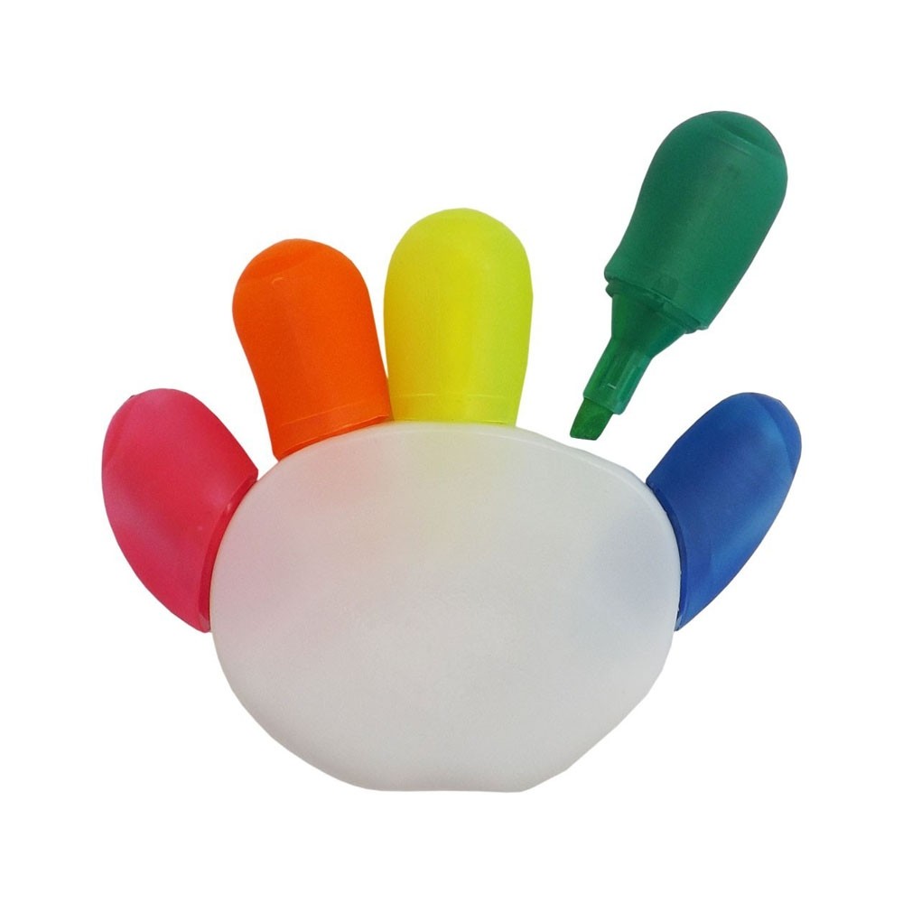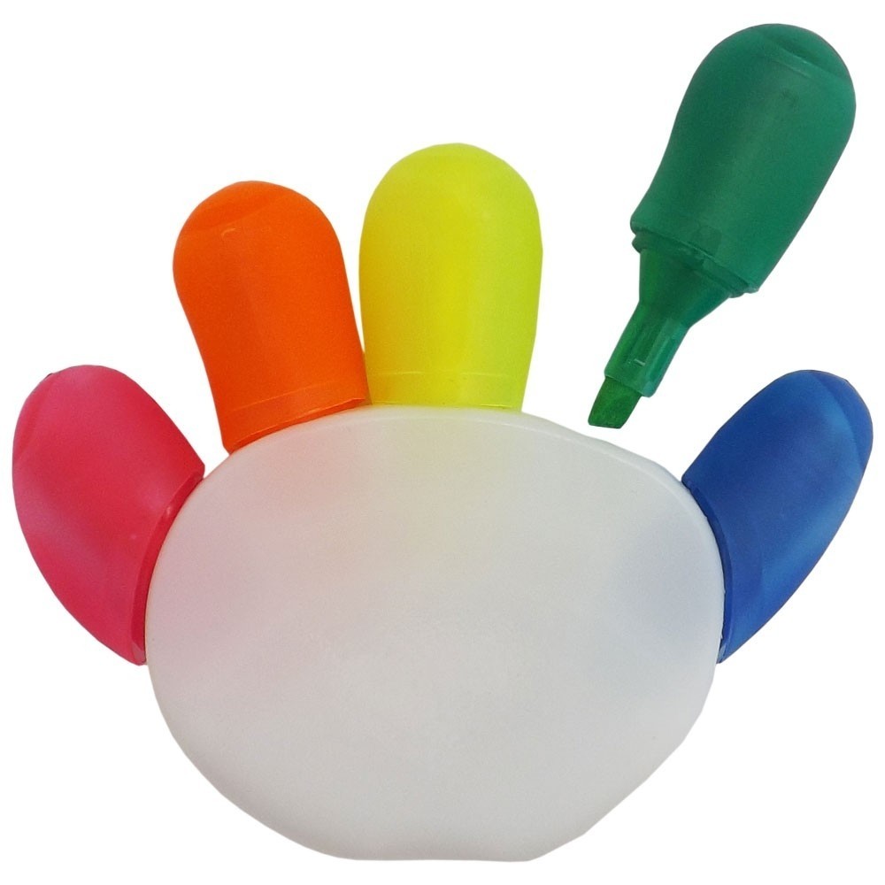 CANETA MARCA TEXTO DE 5 CORES NO FORMATO DE MÃO, MATERIAL DE PLÁSTICO. EMBALAGEM, SAQUINHO PLÁSTICO. MEDIDAS TOTAL: 8.5 X 10.5 X 2.5 CM. PESO TOTAL: 23 GRAMAS.
