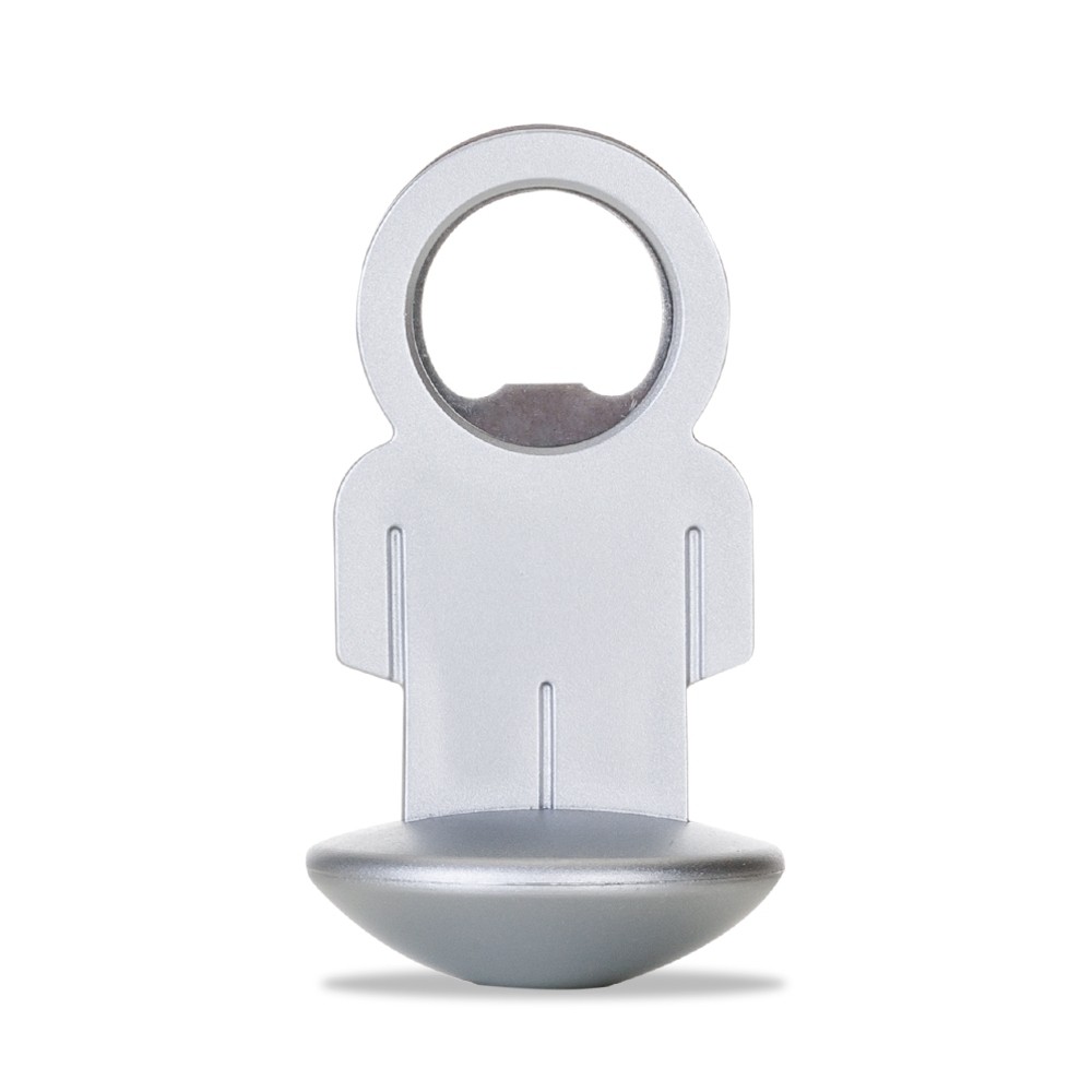 Abridor de garrafa no formato de homem, com peso na base que permite movimento na peça. Material de plástico resistente. Medidas para gravação: 2.3 x 2.8cm. Tamanho total: 10 x 4.3cm. Peso do produto: 63 gramas.