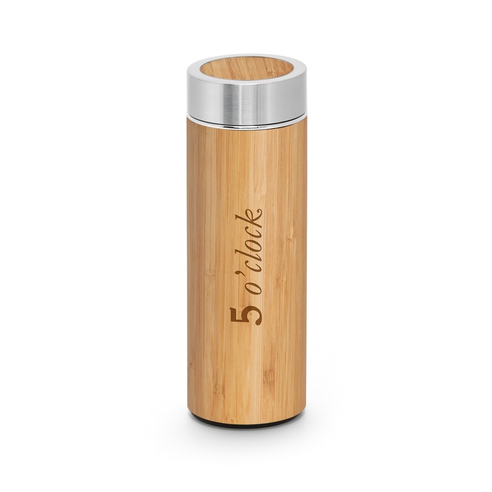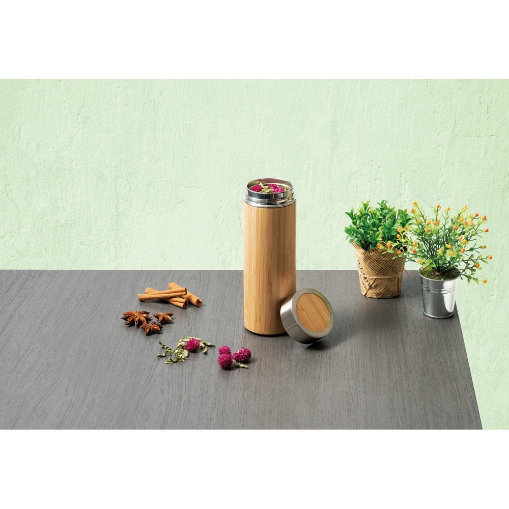 GARRAFA EM AÇO INOX E BAMBU DE PAREDE DUPLA TÉRMICA, ISOLADA A VÁCUO. COM TAMPA EM AÇO INOX COM DETALHE EM BAMBU. INFUSOR DE CHÁ NO INTERIOR INCLUSO. CAPACIDADE ATÉ 430 ML. PRESERVA AS BEBIDAS QUENTES POR 8 HORAS E AS BEBIDAS FRIAS POR 12 HORAS. FORNECIDO EM CAIXA PRESENTE. CERTIFICAÇÃO EU FOOD GRADE. A COR E O RESULTADO DA IMPRESSÃO NOS MATERIAIS NATURAIS PODE VARIAR ENTRE PRODUTOS. Ø69 X 207 MM | CAIXA: 72 X 210 X 72 MM