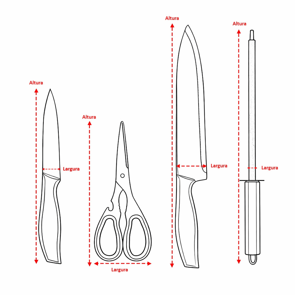KIT CHURRASCO FORMADO POR QUATRO ITENS EM INOX: UMA FACA DE 8 POLEGADAS, UMA FACA DE 5 POLEGADAS, UMA CHAIRA E UMA TESOURA COM DETALHES EMBORRACHADOS NO CABO. ACOMPANHA EMBALAGEM EM PAPELÃO. ALTURA: 32 CM LARGURA: 8,5 CM PROFUNDIDADE: 2,5 CM MEDIDAS APROXIMADAS PARA GRAVAÇÃO: 28CM X 7CM (EMBALAGEM) PESO APROXIMADO: 364 GRAMAS PEDIDO MÍNIMO: 20 UNIDADES - Informação Adicional