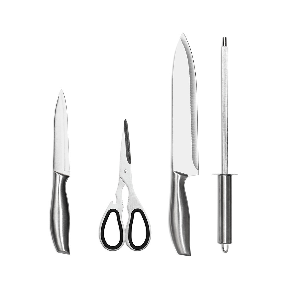 KIT CHURRASCO FORMADO POR QUATRO ITENS EM INOX: UMA FACA DE 8 POLEGADAS, UMA FACA DE 5 POLEGADAS, UMA CHAIRA E UMA TESOURA COM DETALHES EMBORRACHADOS NO CABO. ACOMPANHA EMBALAGEM EM PAPELÃO.