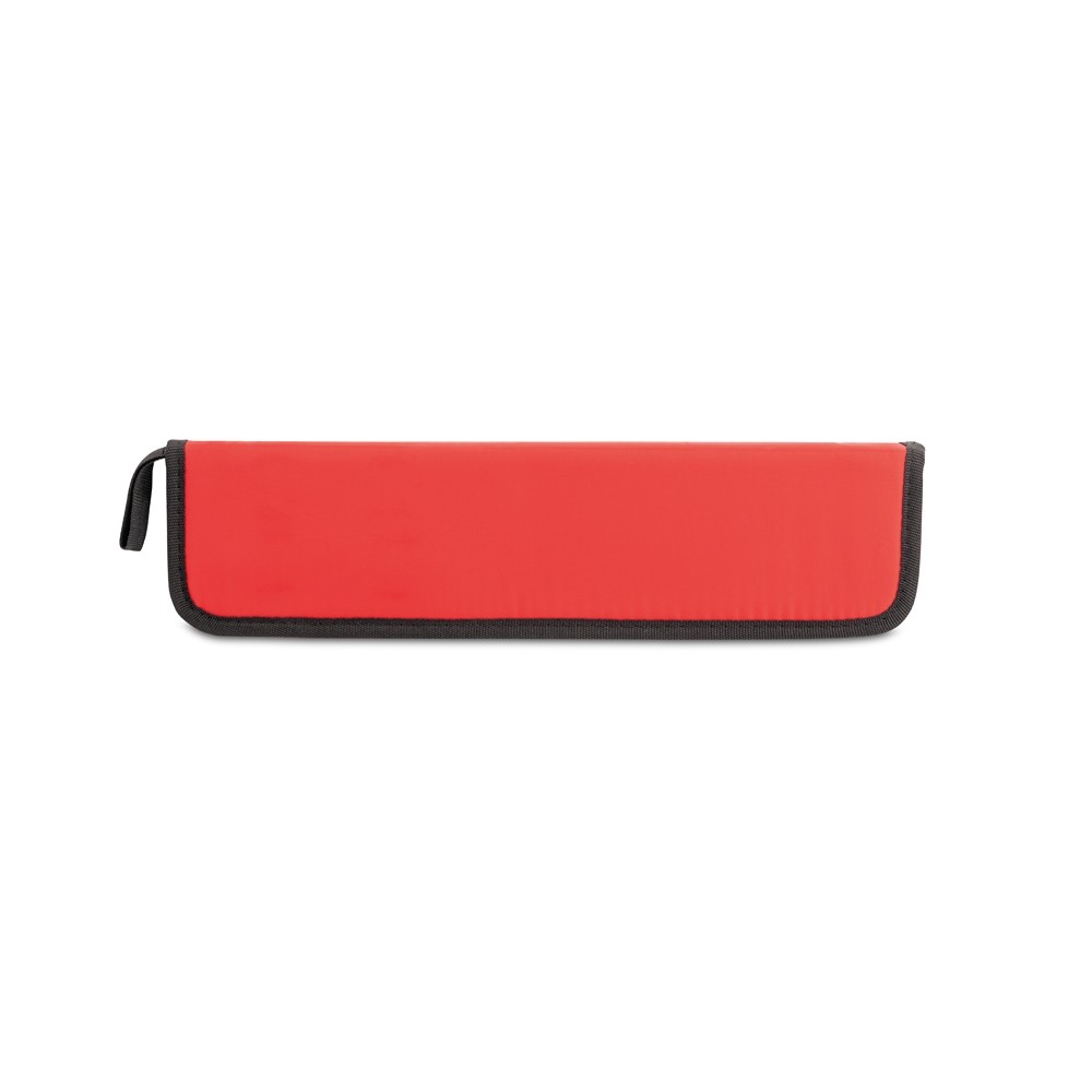 KIT CHURRASCO EM ESTOJO DE 210D. COMPOSTO POR 2 UTENSÍLIOS EM AÇO INOX: FACA CHEFE E GARFO. PRÓPRIO PARA CONTATO COM ALIMENTO. ESTOJO: 350 X 130 X 20 MM