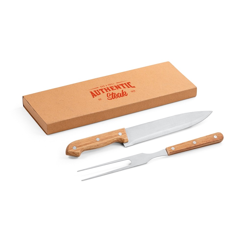 KIT CHURRASCO EM CAIXA KRAFT DE PAPEL RECICLADO. COMPOSTO POR 2 UTENSÍLIOS EM AÇO INOX E BAMBU: FACA CHEFE E GARFO. CERTIFICAÇÃO EU FOOD GRADE. A COR E O RESULTADO DA IMPRESSÃO NOS MATERIAIS NATURAIS PODE VARIAR ENTRE PRODUTOS. CAIXA: 340 X 115 X 25 MM