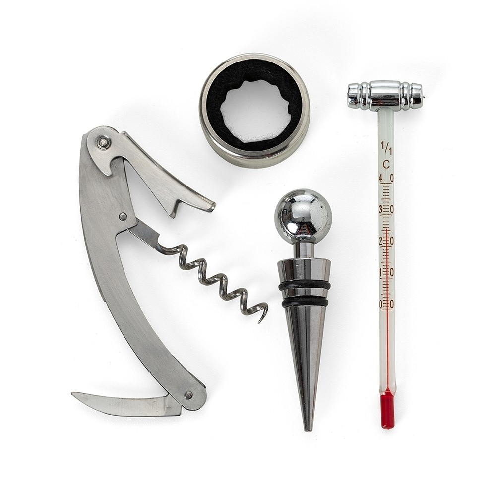 Kit vinho 4 peças com estojo, parte interna revestida de espuma. Possui tampa de bico, saca rolha, termômetro e wine collar. Altura: 15.8 x Largura: 13.7 x Espessura: 3cm. Medidas aproximadas para gravação: 11 x 11cm. Peso aproximado: 214 gramas.