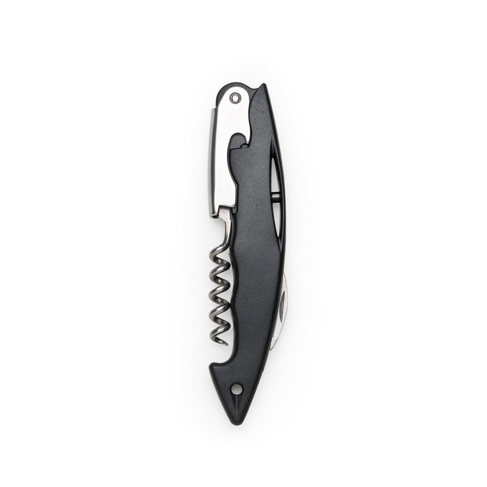 Saca rolhas inox com corpo plástico fosco. Possui saca rolhas, abridor de garrafa e lâmina. Parte inferior do saco rolha com detalhe circular vazado. Medidas aproximadas para gravação: 5 x 1.5cm. Tamanho total aproximado: 13.9 x 3.3cm. Peso aproximado: 79 gramas. - Informação Adicional