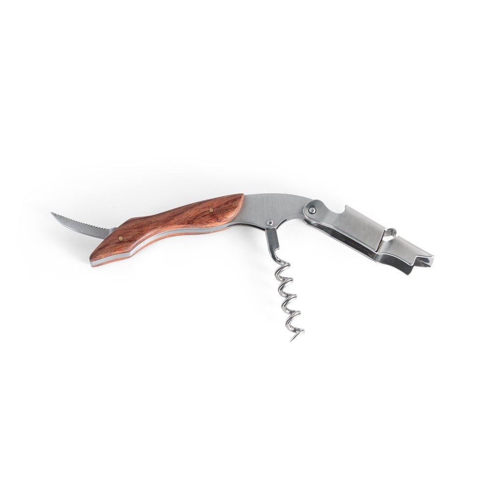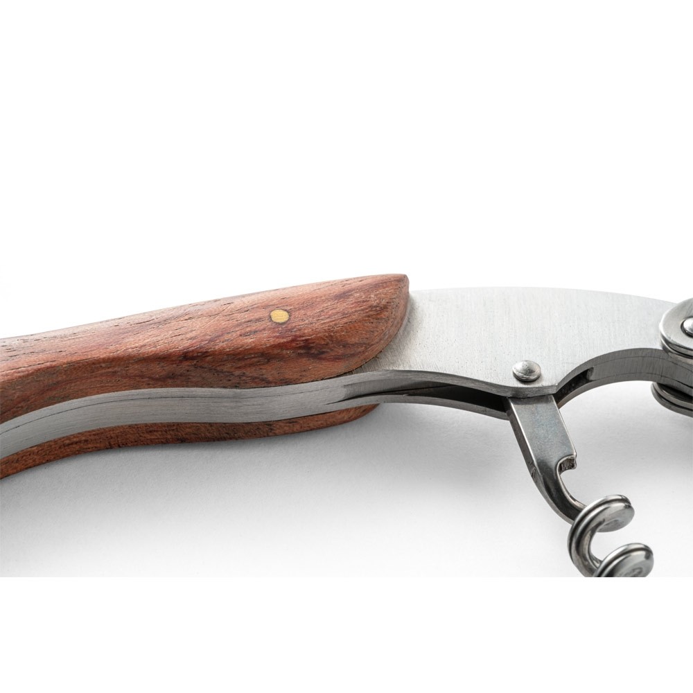 SACA ROLHAS EM MADEIRA E AÇO INOX. COM SISTEMA DE MOLA PARA EXTRAÇÃO EM DUAS FASES. COM CANIVETE DE ESCANÇÃO. 120 X 28 X 13 MM