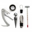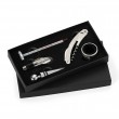 Kit vinho 5 peças com estojo, parte interna revestida de espuma. Possui tampa de bico, saca rolha, bico condutor, termômetro e wine collar. Altura: 22 x Largura: 11.9 x Espessura: 2.8cm. Medidas aproximadas para gravação: 10 x 10cm. Peso aproximado: 246 gramas.