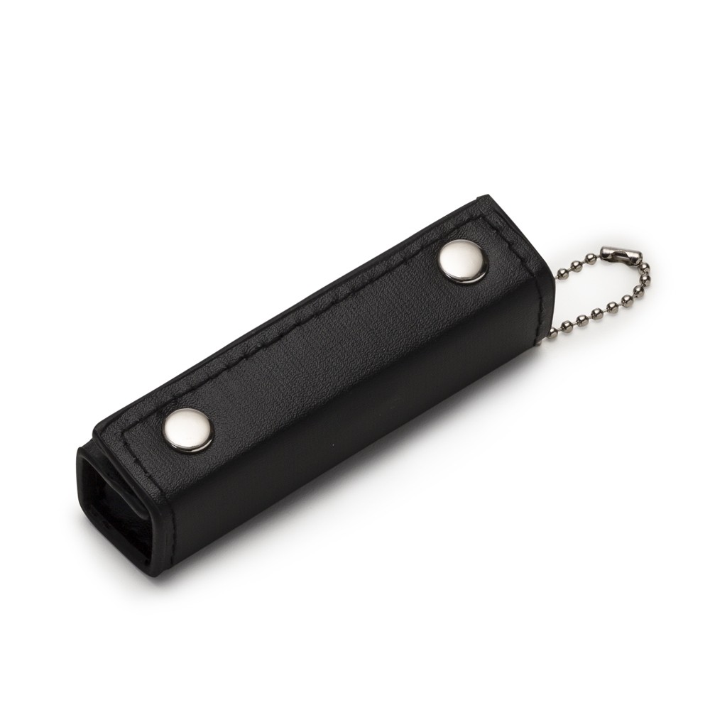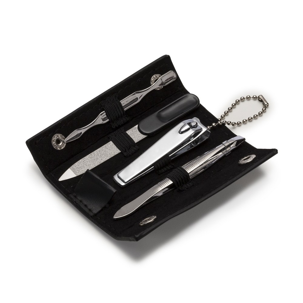 Kit Manicure 4 peças em estojo de couro sintético revestido com veludo interno. Possui dois botões para lacrar o estojo, acompanha corrente e parte interna com alça em couro sintético. Contém: limpador de unha, lixa, cortador de unha e pinça. Medidas para gravação: 5.5 x 1.5cm. Tamanho total: 9.9 x 2.8cm. Peso total: 42 gramas.
