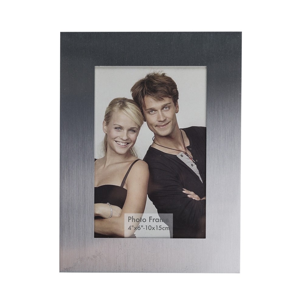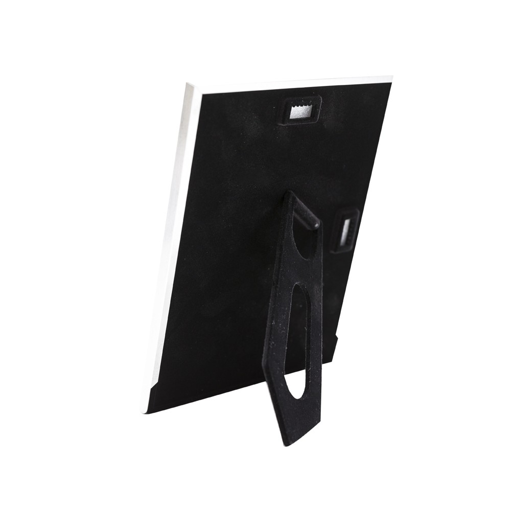 Porta retrato de alumínio, tamanho de “4 x 6” - 10 x 15cm. Parte traseira revestida com veludo inclusive o apoio, possui 2 “buracos” caso haja necessidade de pendurá-lo. Medidas para gravação: 2.9 x 9.5cm. Peso total: 230 gramas.