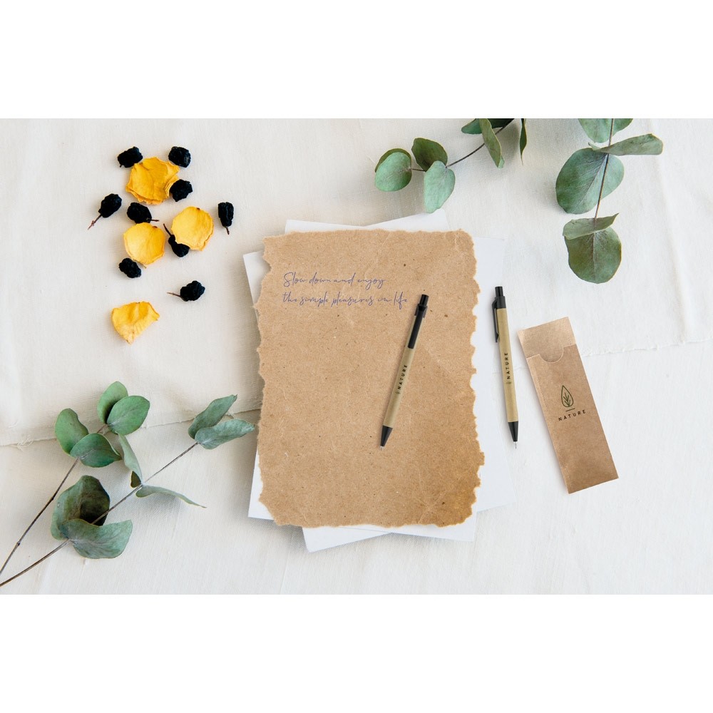 CONJUNTO DE ESFEROGRÁFICA E LAPISEIRA EM PAPEL KRAFT RECICLADO COM CLIPE E PONTEIRA DE PLÁSTICO. A LAPISEIRA É DE 0.5 MM. ESCRITA EM AZUL. FORNECIDO COM UMA BOLSA EM CARTÃO. Ø10 X 138 MM | BOLSA: 175 X 55 MM