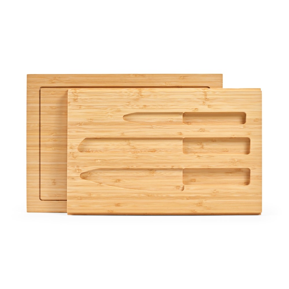 CONJUNTO DE TÁBUAS EM BAMBU COM 3 FACAS INCLUSAS. COMPOSTO POR DUAS TÁBUAS: A TÁBUA EXTERIOR E A TÁBUA INTERIOR QUE ASSUME DUAS FUNCIONALIDADES - UM COMPARTIMENTO PARA TRÊS FACAS INCLUSAS (FACA DE LEGUMES, FACA DE PÃO, FACA DE COZINHA) E COMO TÁBUA DE CORTE. FORNECIDA EM CAIXA PRESENTE EM PAPEL KRAFT RECICLADO. CERTIFICAÇÃO EU FOOD GRADE. A COR E O RESULTADO DA IMPRESSÃO NOS MATERIAIS NATURAIS PODE VARIAR ENTRE PRODUTOS. 390 X 280 X 45 MM | TÁBUA EXTERIOR: 390 X 280 X 15 MM | TÁBUA INTERIOR: 380 X 250 X 15 MM