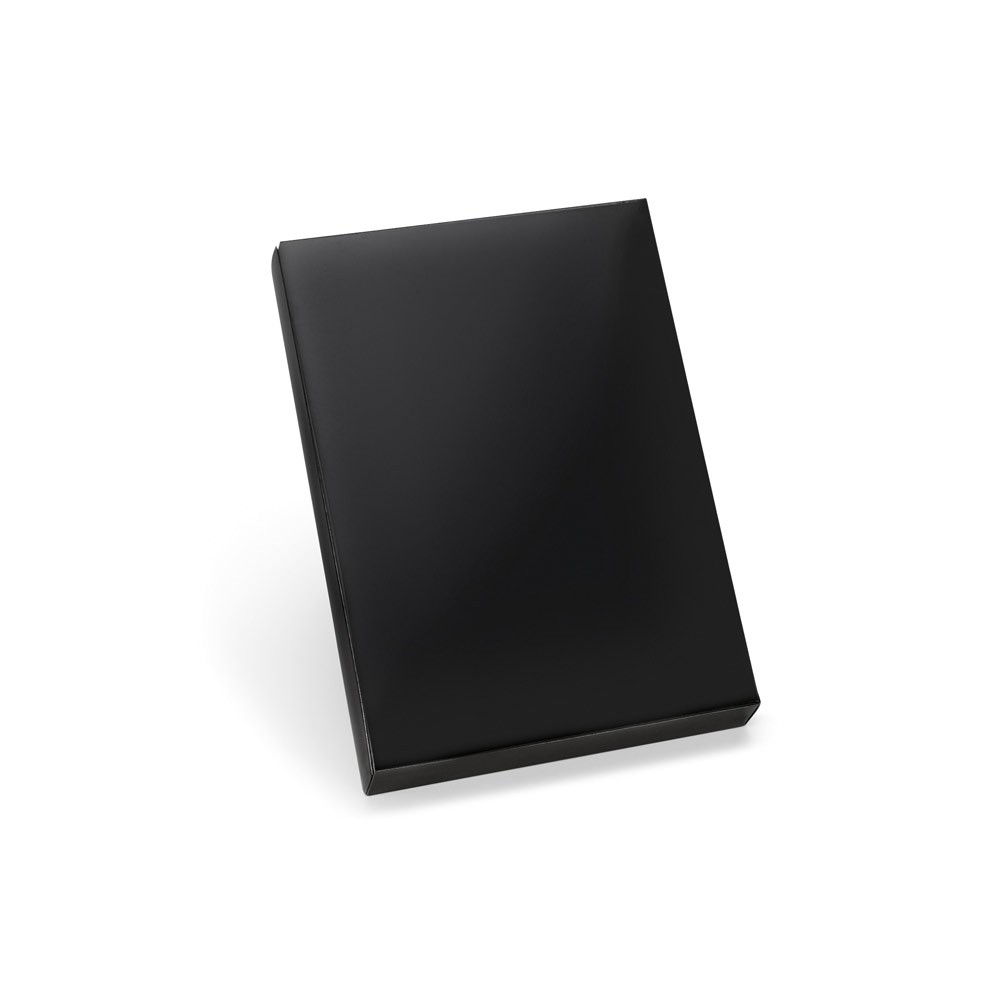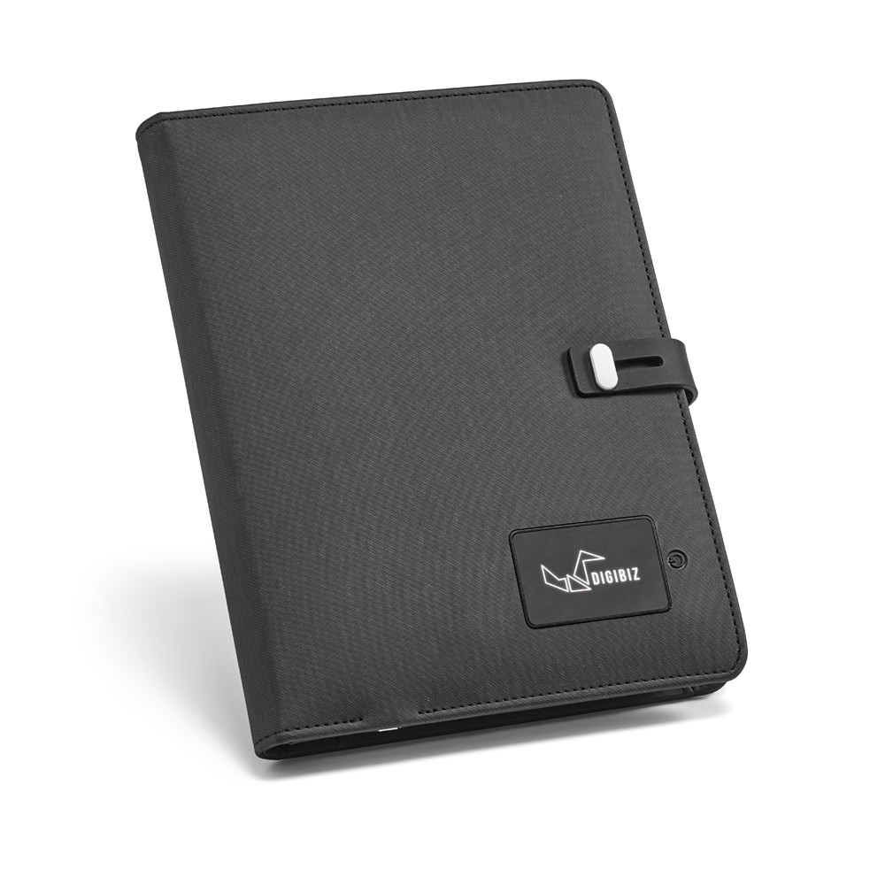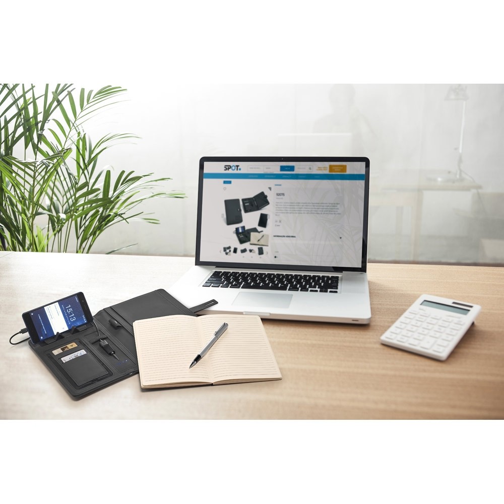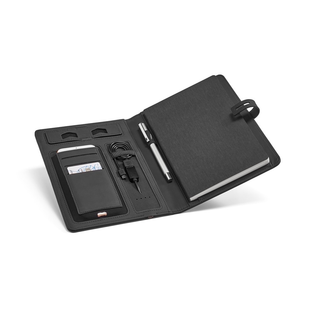 PASTA A5 EM C. SINTÉTICO COM BATERIA PORTÁTIL EMBUTIDA (LÍTIO). A BATERIA TEM CAPACIDADE PARA 4.000 MAH, TEMPO DE VIDA ≥ 500 CICLOS COM ENTRADA/SAÍDA 5V/1A E CABO USB / MICRO USB PARA CARREGAR A BATERIA. NO INTERIOR, CONTÉM UM CADERNO REMOVÍVEL COM 64 FOLHAS PAUTADAS DE COR MARFIM, UM SUPORTE PARA ESFEROGRÁFICA (NÃO INCLUSA), ELÁSTICOS PARA ORGANIZAÇÃO E SUPORTE PARA SMARTPHONE. NO EXTERIOR, UMA PLACA COM ACABAMENTO EMBORRACHADO, LED INTERIOR E BOTÃO ON/OFF. FORNECIDA EM CAIXA PRESENTE. 165 X 225 X 25 MM | PLACA: 55 X 35 MM | CAIXA: 180 X 240 X 35 MM