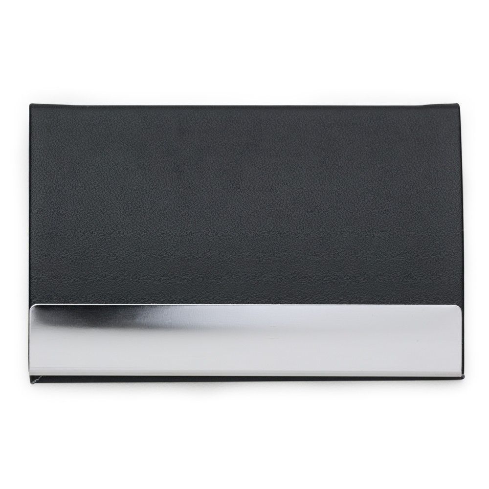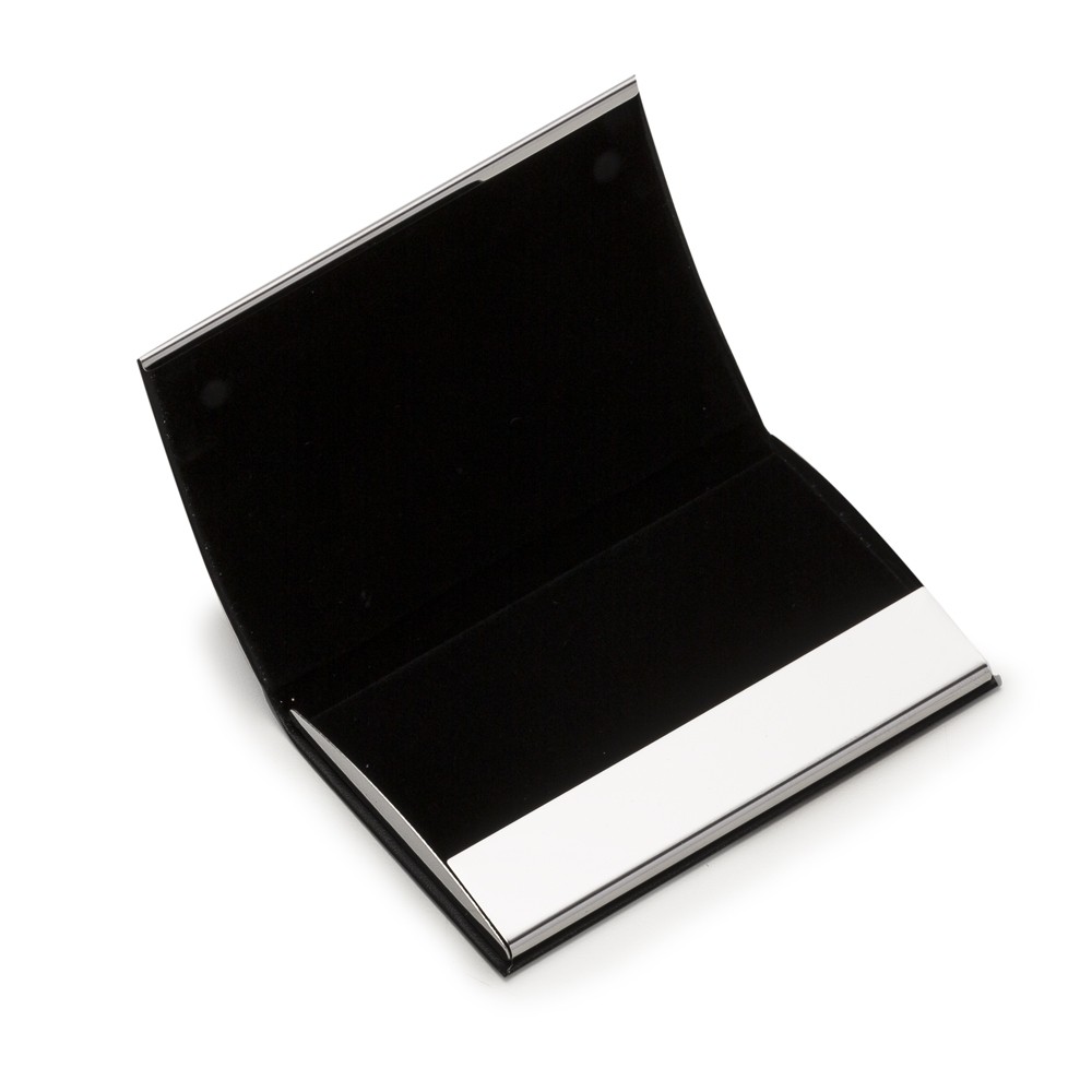 Porta cartão de couro sintético liso frente e verso, parte inferior da “tampa” em metal brilhante para personalização e laterais metálicas também. Parte interna revestida de veludo, abre/fecha por imã. Medidas para gravação: 1.5 x 10cm. Peso total: 80 gramas.