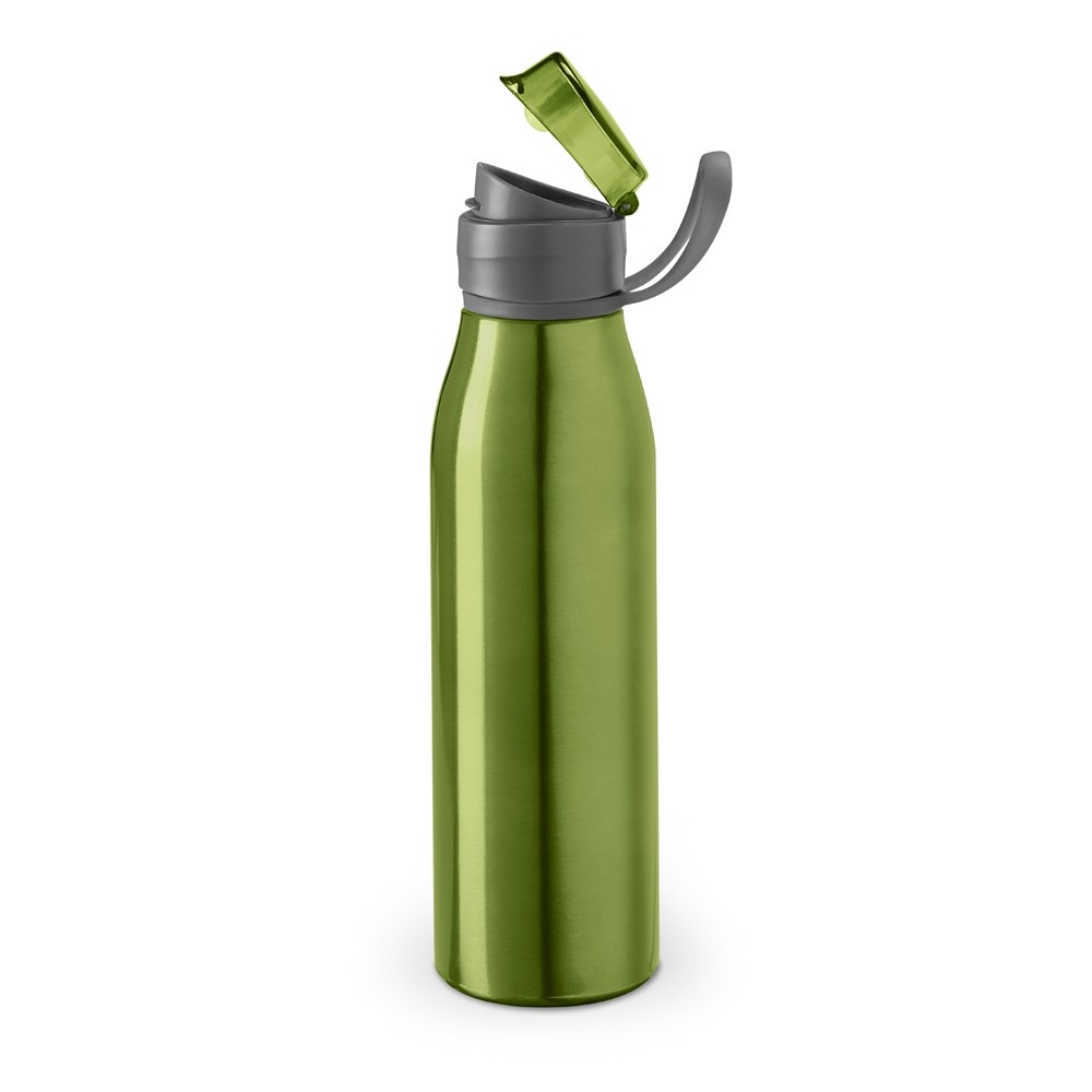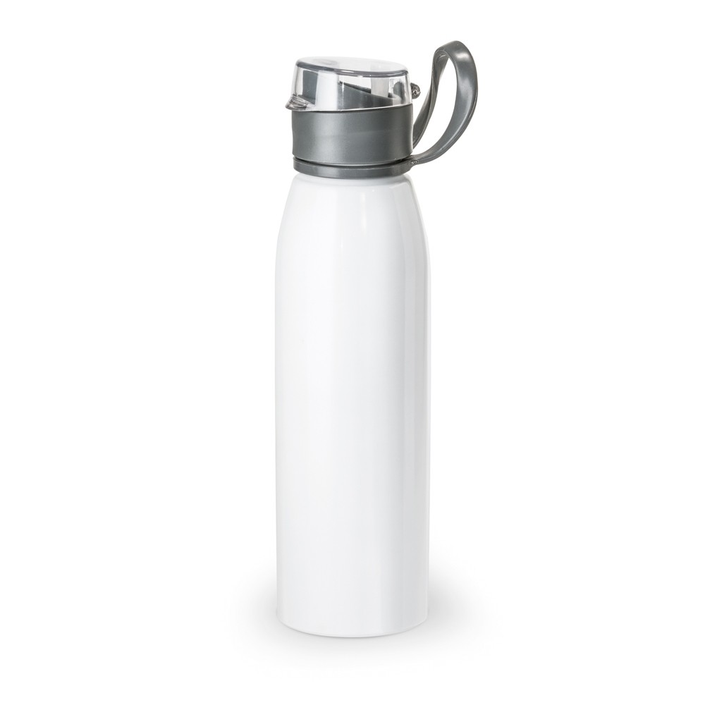 SQUEEZE EM ALUMÍNIO E TAMPA FLIP FLOP EM AS E PP, COM ALÇA EM SILICONE PARA FACILITAR O TRANSPORTE. CAPACIDADE ATÉ 650 ML. CAIXA BRANCA VENDIDA OPCIONALMENTE. CERTIFICAÇÃO EU FOOD GRADE. Ø66 X 250 MM - Informação Adicional