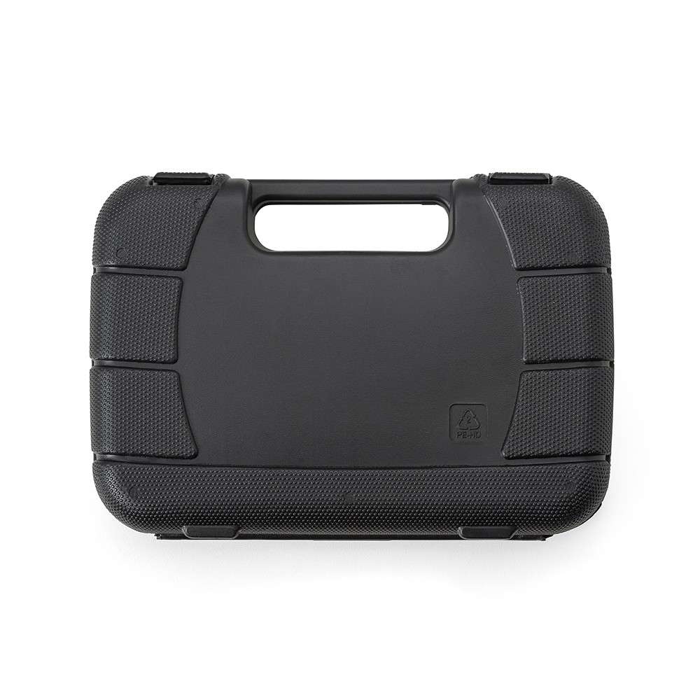 Kit ferramenta 8 peças em estojo plástico. Maleta plástica com detalhe retangular no centro frontal e verso liso, possui texturização no estojo e duas travas superiores. Acompanha: fita isolante, martelo, alicate, chave Philips, chave teste, chave de fenda, trena 2 metros e estilete. Altura: 17.5 x Largura: 24.8 x Espessura: 5.5cm. Medidas aproximadas para gravação: 4.3 x 8.8cm. Peso aproximado: 770 gramas. - Informação Adicional