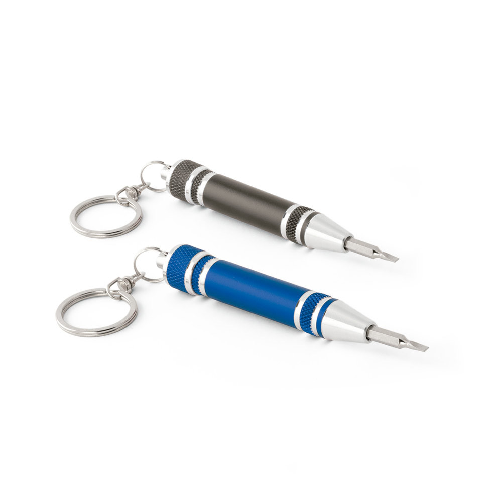 CONJUNTO DE MINI CHAVE DE PARAFUSOS EM METAL COM 3 PONTAS DIFERENTES REMOVÍVEIS, TENDO OPÇÃO DE GUARDAR AS PEÇAS NO TOPO DO CORPO COM TAMPA. CHAVEIRO INCLUSO. Ø13 X 75 MM