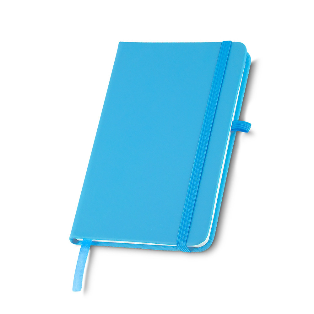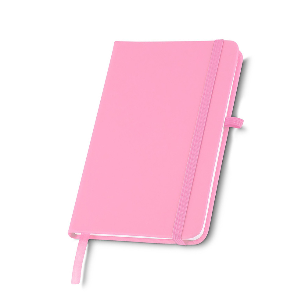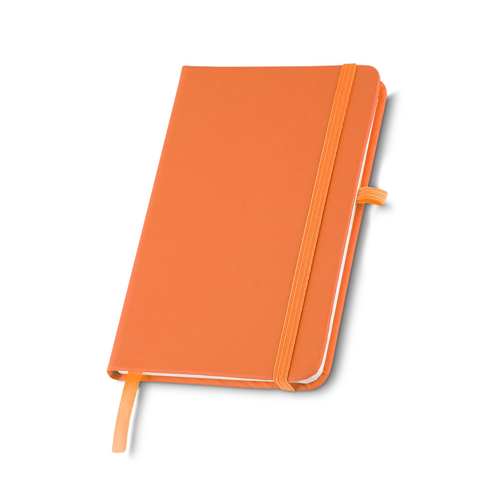 CADERNETA TIPO MOLESKINE EMBORRACHADO COM PORTA CANETA ELÁSTICO EM NYLON, MARCADOR DE PÁGINA EM CETIM E FITA ELÁSTICA DE NYLON PARA FECHAR. CONTÉM APROXIMADAMENTE 80 FOLHAS PARDAS PAUTADAS.