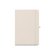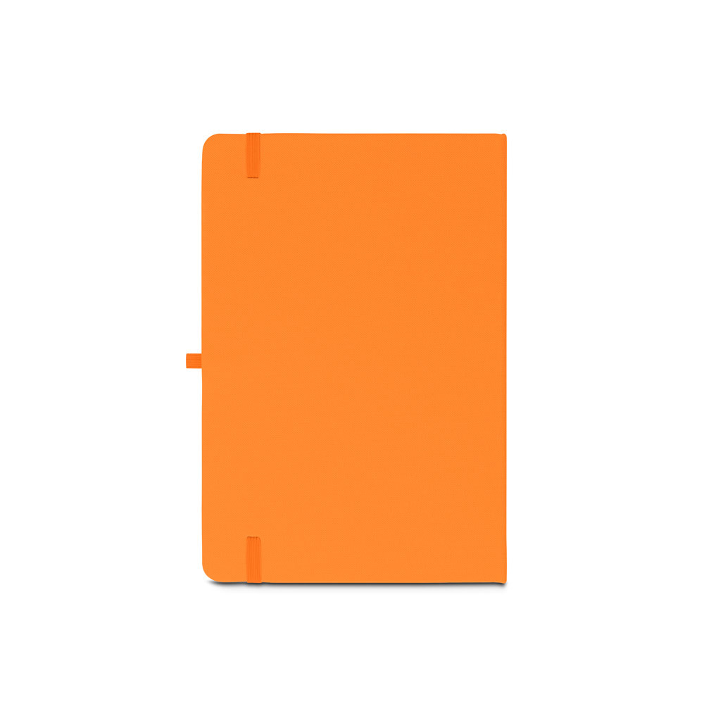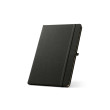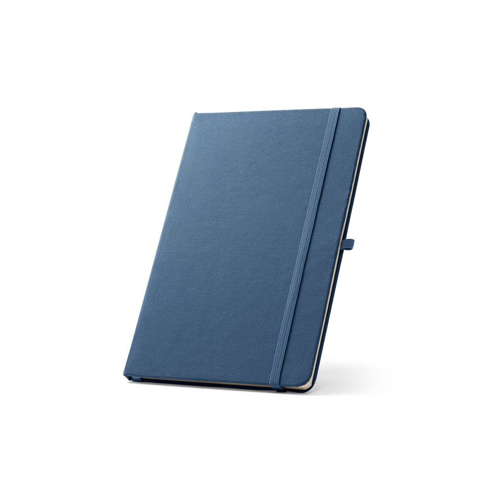 CADERNO A5 DE CAPA DURA EM PET 100% RECICLADO (RPET) 300D, COM CANTOS REDONDOS. CONTÉM 160 PÁGINAS, EM PAPEL 100% RECICLADO, PAUTADAS COR DE MARFIM, FITA SEPARADORA, SUPORTE PARA ESFEROGRÁFICA (NÃO INCLUSA) E ELÁSTICO PARA FECHO DO CADERNO. NA PARTE INFERIOR DA LOMBADA, TEM IMPRESSO EM BRANCO O SÍMBOLO DO RPET. 143 X 211 MM