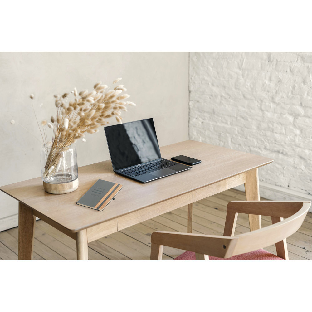 CADERNO A5 COM CAPA DURA EM CORTIÇA E PU E 96 FOLHAS PAUTADAS EM COR MARFIM. CONTÉM ELÁSTICO, FITA SEPARADORA E SUPORTE PARA ESFEROGRÁFICA (NÃO INCLUSA). FORNECIDO EM BOLSA DE NON-WOVEN. 140 X 210 MM