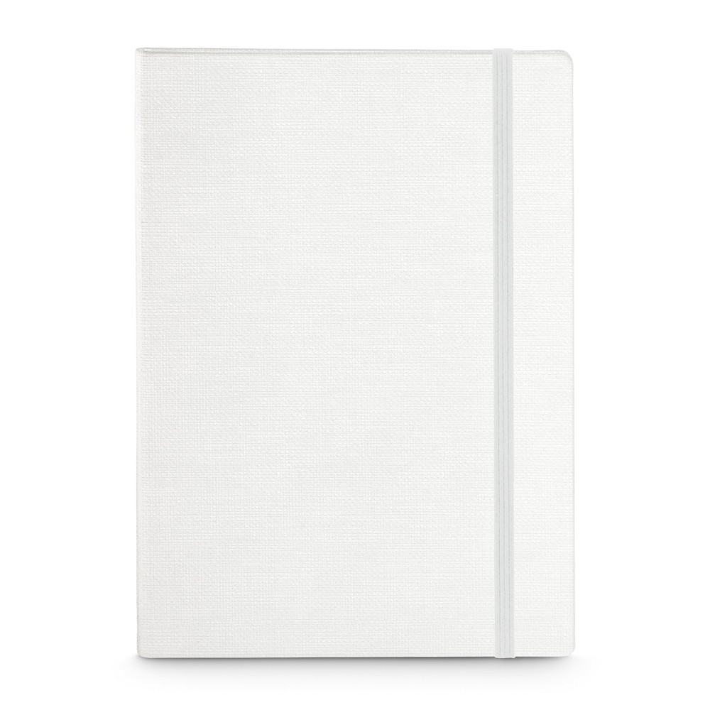 Caderno capa dura em cartão e em PU térmico. 100 folhas pautadas com limite de pagina em arco-íris. 90 x 140 mm