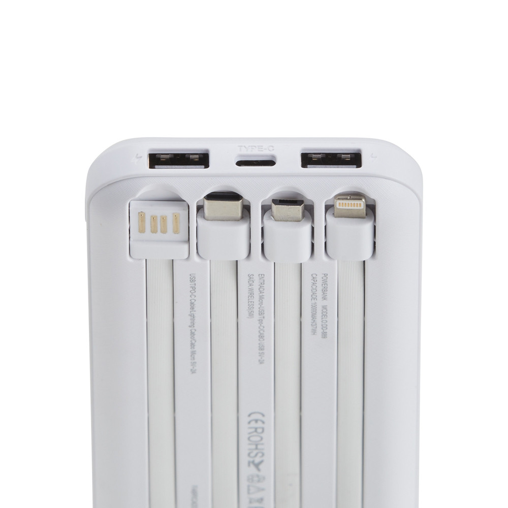CARREGADOR PORTÁTIL POWER BANK COM 10.000MAH E CARREGAMENTO VIA INDUÇÃO OU VIA CABO. COM DISPLAY DIGITAL INDICADOR DE BATERIA, O CARREGADOR CONTÉM QUATRO CABOS ACOPLADOS: LIGHTNING, TIPO-C, V8 E SAÍDA USB PARA O CARREGAMENTO DA PRÓPRIA BATERIA. PORTAS DE ENTRADA: V8, TIPO-C E DUAS PORTAS USB. LARGURA: 6.9CM X ESPESSURA: 2.2CM X COMPRIMENTO: 14.8CM. MEDIDAS APROXIMADAS PARA GRAVAÇÃO: 3.5CM X 5CM. PESO APROXIMADO: 227 GRAMAS.
