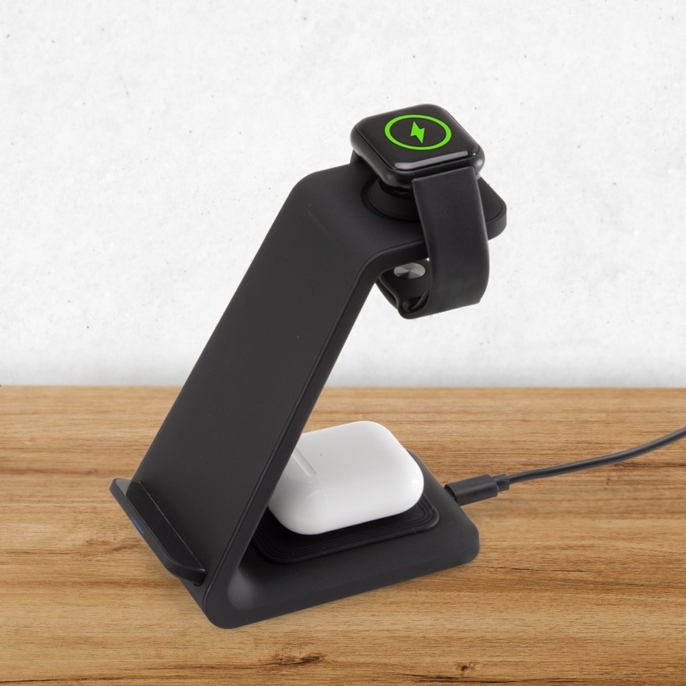 BASE DE CARREGAMENTO 3 EM 1 VIA INDUÇÃO. CAPAZ DE CARREGAR SIMULTANEAMENTE CELULAR, IWATCH E FONES DE OUVIDO ATRAVÉS DA TECNOLOGIA DE INDUÇÃO QI, A BASE CONTÉM FRESTAS PARA AUXILIO DA CIRCULAÇÃO DE AR, ACELERANDO O RESFRIAMENTO E PROPORCIONANDO UMA DISSIPAÇÃO DE CALOR IDEAL AO PRODUTO. ACOMPANHA CABO USB TIPO C. ALTURA: 13.1 X LARGURA: 7.1CM. MEDIDAS APROXIMADAS PARA GRAVAÇÃO: 10 X 5CM. PESO APROXIMADO: 150 GRAMAS.