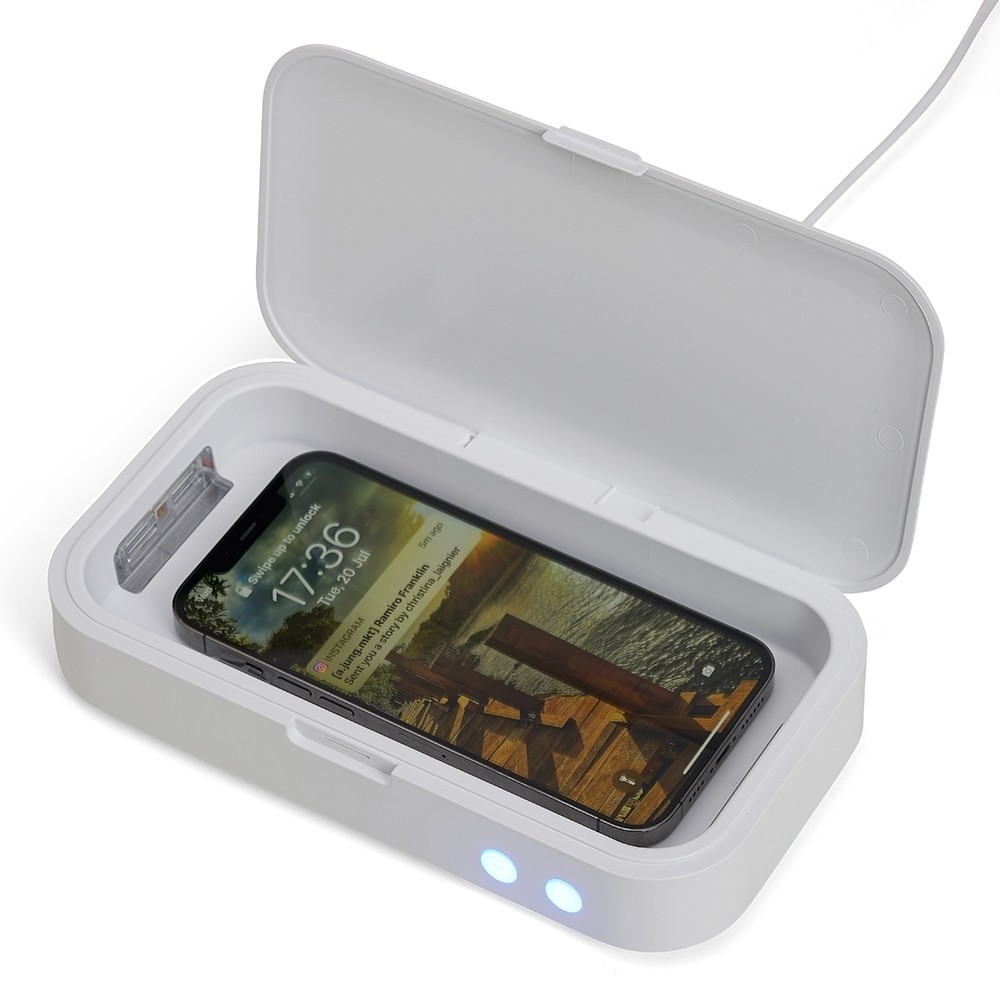 CAIXA ESTERILIZADORA UV MULTIFUNCIONAL. O PRODUTO ESTERILIZA OBJETOS ATRAVÉS DA EXPOSIÇÃO A LUZ UV-C, CONHECIDA POR ELIMINAR 99% DOS VÍRUS E BACTÉRIAS APÓS UM CURTO PERÍODO DE EXPOSIÇÃO. O PRODUTO TAMBÉM POSSUI A FUNÇÃO DE AROMATERAPIA, PERMITINDO A UTILIZAÇÃO ÓLEOS ESSENCIAIS A BASE DE PLANTAS (NÃO INCLUSOS) PARA AROMATIZAR OS OBJETOS ESTERILIZADOS. O PRODUTO ACOMPANHA: PANO PARA LIMPEZA DE SUPERFÍCIES, CABO USB TIPO C E MANUAL DE INSTRUÇÕES. ALTURA: 22 X LARGURA 12 X ESPESSURA: 4.2CM. MEDIDAS APROXIMADAS PARA GRAVAÇÃO: 19 X 9CM. PESO APROXIMADO: 335 GRAMAS.